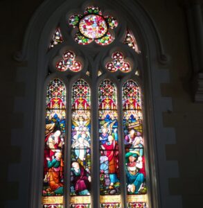 Restored one of the original windows, with additional panels planned as funding becomes available.